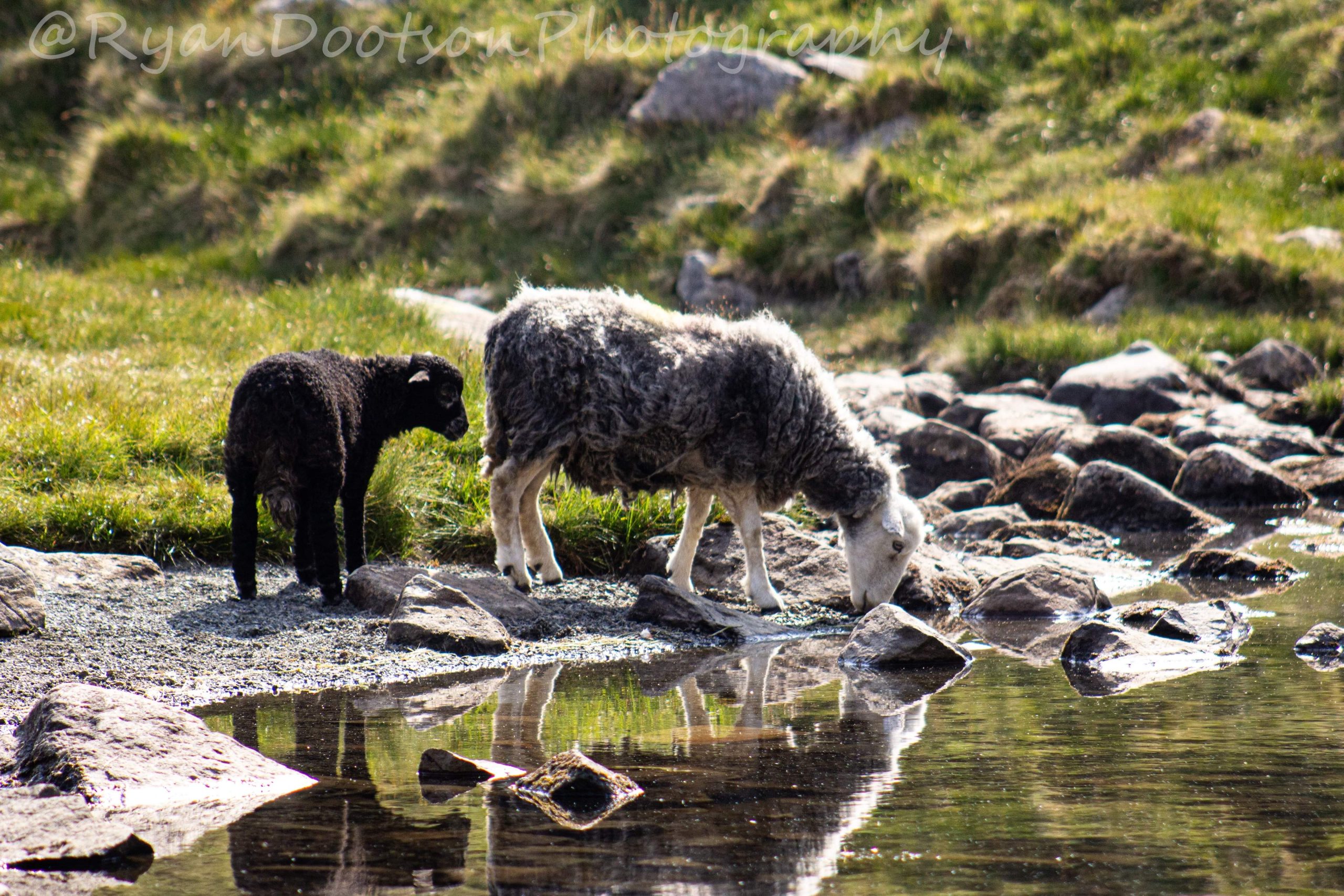 High quality A3 print of a mother sheep leading her lamb to drink from angle tarn.